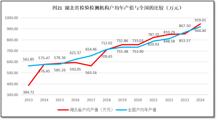 由图20可见,总体来看,湖北省检验检测机构户均年产值持续保持增长,仅在2017年和2020年出现过两次轻微下跌。2024年湖北省检验检测机构户均年产值为944.4万元,是2013年的2.45倍。从增长率的曲线来看,除了头两年数据误差大显得增长率很高之外,湖北省在2018年出现一次比较显著的增长率高峰,增幅达到26.01%,其余年份增幅不大,2024年度的增幅是最近五六年来最高的一次,达到10.64%。