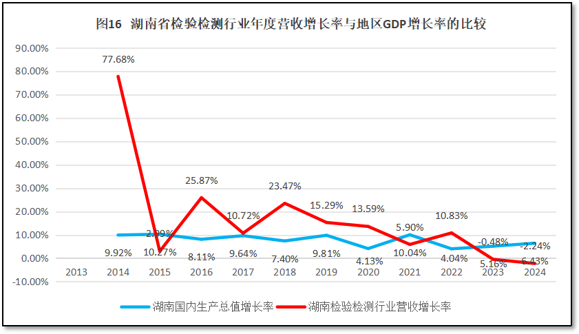 来看湖南省GDP年度增长曲线与湖南省检验检测机构年度营收总额增长曲线的比较,如图16所示。