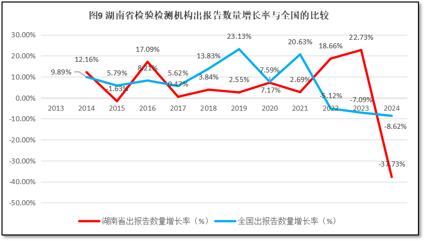 湖南省检验检测机构出具报告数量的增长率与全国检验检测机构出具报告增长率的比较,如图9所示。